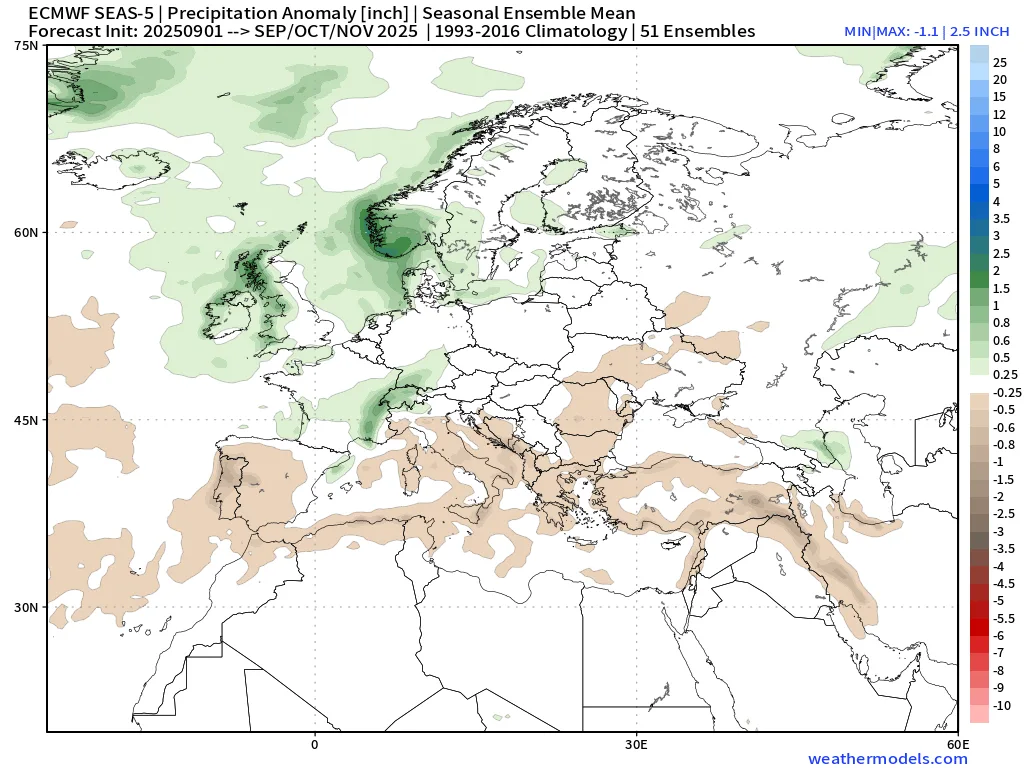 2025 Sonbaharı; Batı ve Kuzey Avrupa’da yağışlı ve fırtınalı, Doğu Avrupa’da kurak, Türkiye’de ise ilk yarısı kurak – ikinci yarısı batıda yağışlı bir tabloyla geçecek. Kasım’dan itibaren erken kış belirtileri dikkat çekecek. Haritalar ve modeller, bu tahminleri görsel olarak destekleyebilir.