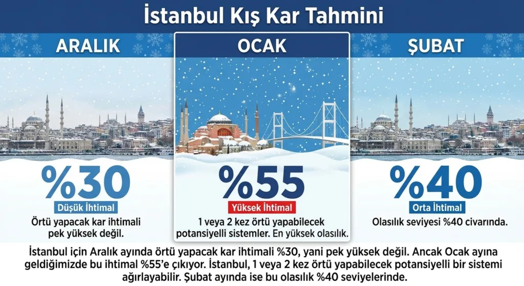 - İstanbul: Isı adası etkisi nedeniyle Aralık ayında kar görme ihtimali %30’un altında. Ancak Ocak ayında “Açık Avrupa Koridoru” devreye girecek. Balkanlar üzerinden (Trakya rotalı) gelecek sistemlerde Avrupa yakası, Karadeniz üzerinden (DEK) gelecek sistemlerde Anadolu yakası ve Boğaz hattı şanslı olacak. Bu kış İstanbul için en az 1 adet örtü yapan (5-15 cm arası), 2-3 adet ise havada kar görülen sistem öngörülüyor.