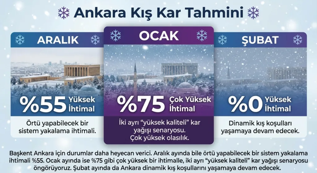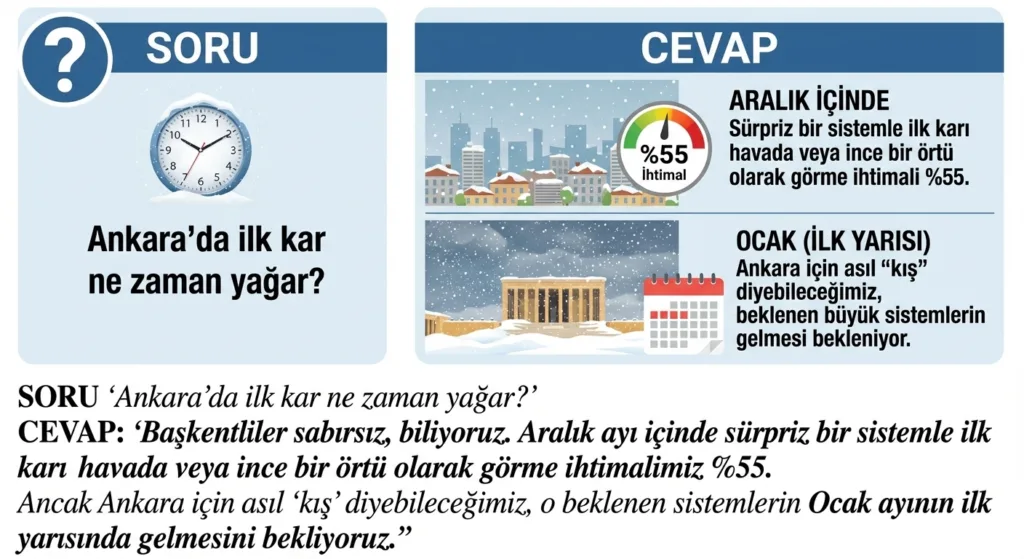 Cevap: Başkentlilerin sabırsızlığını anlıyoruz. Ankara için Aralık ayı içinde (özellikle ayın son haftasına doğru) sürpriz bir sistemle ilk karı havada görme veya çatılarda/arabaların üzerinde ince bir örtü yakalama ihtimalimiz %55. Ancak Ankara için asıl “kış” diyebileceğimiz, okulların tatil edilip ulaşımın aksayabileceği o güçlü sistemlerin Ocak ayının ilk yarısında gelmesini bekliyoruz. Bu kış Ankara, karasal iklimin avantajıyla en şanslı büyükşehirlerden biri.